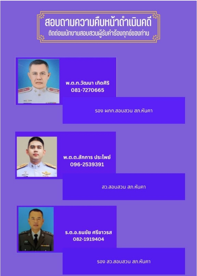 ติดต่อสอบถามความก้าวหน้าการดำเนินคดี 24 เมษายน 2567 โดย admin / ไม่ระบุหมวดหมู่ จำนวนผู้เช้าชม : 68 ติดต่อพนักงานสอบสวน