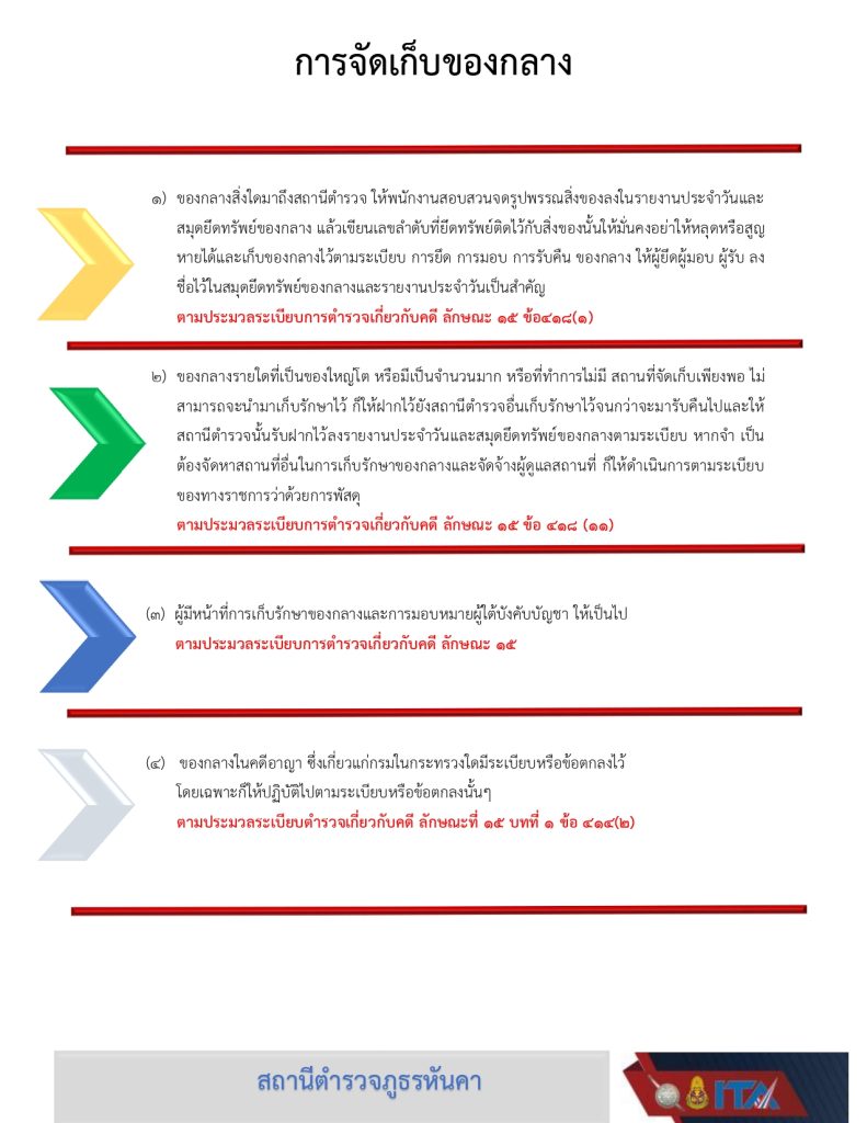 • กำหนดแนวทางหรือหลักเกณฑ์การรับของบริจาคของสถานีตำรวจ• กำหนดแนวทางควบคุม กำกับ ดูแลรักษา ตรวจนับ ตรวจสอบสภาพการใช้งานของบริจาค โดยเฉพาะทรัพย์ประเภทที่มีความเสี่ยงต่อการนำไปใช้โดยมิชอบ• กำหนดแนวทางการยืมหรือเบิกจ่ายของบริจาค ไปใช้ปฏิบัติงานที่ชัดเจน• แนวทางการเผยแพร่หรือเสริมสร้างความรู ้ ความเข้าใจให้เจ้าหน้าที่สามารถใช้ของบริจาคได้อย่างถูกต้อง