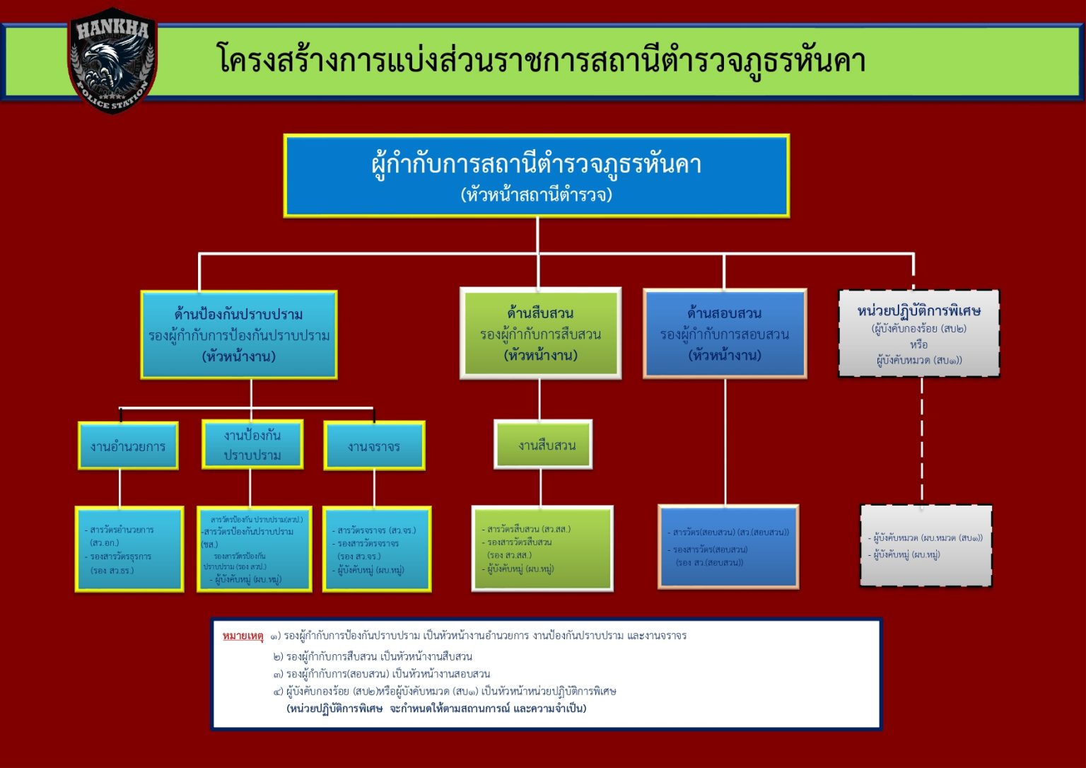 ที่แสดงถึงการแบ่งสายงานต่าง ๆ ภายในหน่วยงาน (ตามรูปแบบโครงสร้างสถานีตำรวจ)