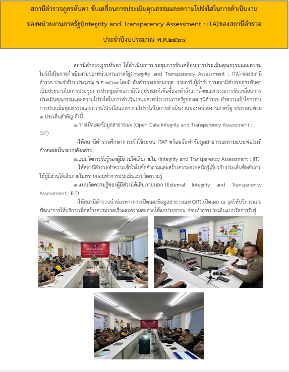 วันที่ 29 พ.ย.67 เวลา 09.30 น. พ.ต.อ.ธนกฤต รวยอารี ผกก.สภ.หันคา พร้อม ด้วย หัวหน้าสายงานทุกสายงาน จัดประชุมชี้แจงเรื่องการประเมินคุณธรรมและความโปร่งใสของหน่วยงานภาครัฐประจำปีงบประมาณ 68 ให้ข้าราการตำรวจในสังกัดได้รับทราบเพื่อร่วมขับเคลื่อนการประเมินของหน่วยโดยชี้แจงผลการประเมินในปีที่ผ่านมาให้ทราบและถอดบทเรียนเพื่อนำจุดบกพร่องมาพัฒนาการประเมินตามตัวชี้วัดด้านต่าง ๆให้มีผลการประเมินที่ดีขึ้น