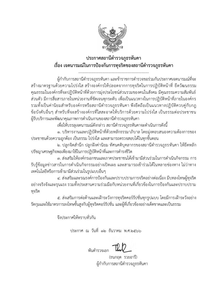 วันที่ 7 ก.พ.2567 เวลา 15.30 น.พล.ต.ท.จิรสันต์ แก้วแสงเอก ผบช.ภ.1 นำข้าราชการตำรวจระดับ รอง ผบช.,ผบก,รอง ผบก.,และ หน.สภ.ในสังกัด ภ.1 ทุกนาย ร่วมประกาศนโยบายต่อต้านการรับสินบน ณ ห้องประชุมอมรวิวัฒน์ ตำรวจภูธรภาค 1 โดยมี พ.ต.อ.ธนกฤต รวยอารี ผกก.สภ.หันคา ร่วมในกิจกรรม ในการประชุมบริหารตำรวจภูธรภาค 1