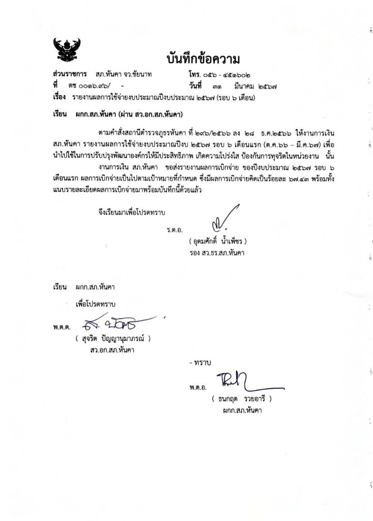 .บันทีกรายงานผลการใช้จ่ายงบประมาณประจำปีงบประมาณ 2567 เสนอหัวหน้าสถานี สถ.หันคา ในรูปแบบไฟล์ PDF คลิ๊กดูที่นี่